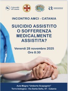 Suicidio assistito o sofferenza medicalmente assistita? Catania 28 novembre 2025 Pubblicato il 31 Ottobre 2025di Segreteria AMCICategorie:Notizie 30-10-2025 – Incontro AMCI 2025 cataniaDownload Segreteria AMCI